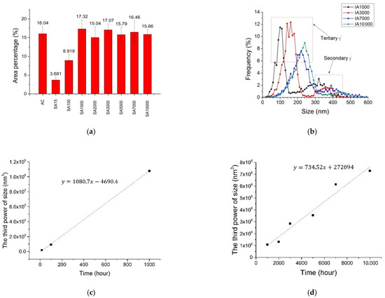 Bimodally distributed γ’ particles’ diameters: (a) quantified area percentage of γ’ particles; (b) quantified size of γ’ particles; (c) a quantification plot of γ’ size with time below 1000 h, and (d) a quantification plot of γ’ with time above 1000 h.