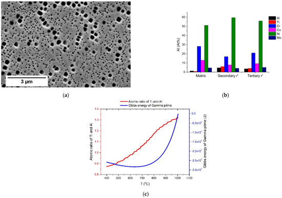 Bimodally distributed γ’ particles’ diameters: (a) a micrograph of the IA1000 sample; (b) a quantification plot of composition of two types γ’ particles; (c) a calculated atomic ratio of Ti and Al and Gibbs energy of γ’ particles.