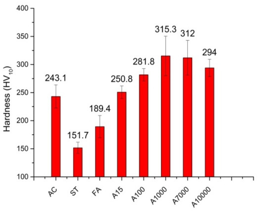 Figure 15 illustrates the hardness data of all examined samples. As shown, the AC sample had a similar hardness to the IA15 sample. However, the area percentage of γ’ particles in the AC sample was about 4 times that in the IA15 sample. In the AC sample, the γ’ particles had a star morphology—a cluster of a few γ’ particles. Conversely, there were, on average, 50 nm spherical particles in the IA15 sample. Therefore, the size and morphology of γ’ particles both have significant effects on the strength of the alloy.