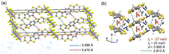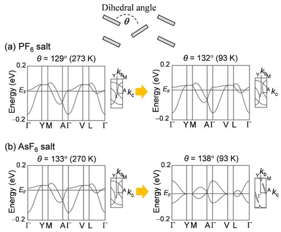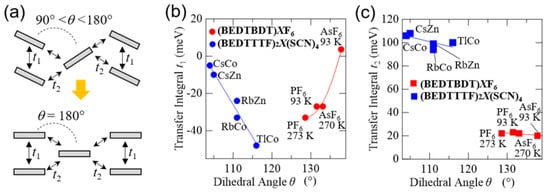 Figure 5 shows the dihedral-angle dependence of the transfer integrals of the BEDT-BDT and BEDT-TTF salts. As illustrated in Figure 5a, the overlap between molecules in the stack is generally expected to increase as θ increases; thus, t1 increases. In the θ-type BEDT-TTF salts, θ changes depending on the size of the counter anion [20]. As θ increases, the absolute value of t1, |t1|, increases linearly (Figure 5b). By contrast, in the BEDT-BDT salts, |t1| decreases as θ increases. The change is not a monotonic linear change but exhibits a sharp curve with a local maximum at the point θ = 128° (the PF6 salt at 273 K). The changes in t2 are 94 < t2 < 108 meV for the BEDT-TTF salts and 20 < t2 < 23 meV for the BEDT-BDT salts. No significant changes are observed in either salt compared with t1. The fact that t1 in the stack of the BEDT-BDT salts is sensitive to θ is due to the shape of the molecular orbital.