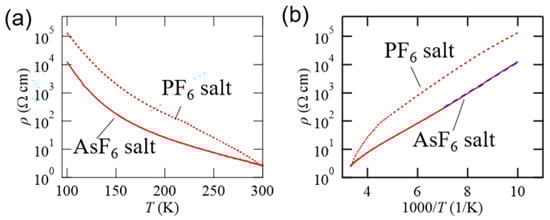 Figure 1 shows the crystal structure of the (BEDT-BDT)AsF6. Half of the BEDT-BDT and AsF6 anion are crystallographically independent. Because the donor: anion composition ratio was 1:1, the AsF6 salt is considered to be a half-filled Mott insulator. The crystal system was monoclinic and the space group was C2/C. Since the Z value is 4, there are four molecules each of BEDT-BDT and AsF6 in the unit cell. The AsF6 salt has the same structure as the PF6 salt reported in a previous study [12]; that is, the BEDT-BDT molecules form alternate layers and are arranged in θ-mode packing. However, the anion molecule AsF6 is disordered. As the temperature factor of the fluorine atoms is large, we analyzed the crystallographic data obtained at 270 K, assuming the temperature factor of the fluorine atoms to be isotropic. The BEDT-BDT molecules form a tilted uniform stack along the b-axis. The interplanar distance is 3.955 Å, which is slightly larger than that in the PF6 salt. There are many short contacts between the BEDT-BDT molecules. S···S short contacts (3.599 Å; blue dotted lines) and S···C short contacts (3.470 Å; red dotted lines) exist between the donor stacks (Figure 1a), whereas S···H short contacts (2.812 Å; green dotted lines) exist within the donor stack (Figure 1b). The intermolecular transfer integrals are t1 = −27 meV and t2 = 22 meV. The value of t1 is slightly smaller than that of the PF6 salt. This is consistent with the increased interplanar distance caused by the larger size of the anion. There is no structural phase transition down to 93 K. The anion molecules are disordered even at 93 K; however, the fluorine atoms could be analyzed as anisotropic (Table S1, see Supporting Information).