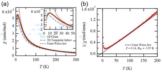 Temperature dependence of (a) magnetic susceptibility. The blue, green, and black dotted lines represent the fitting to the 2D triangular model, 1D chain model, and Curie–Weiss law, respectively. (b) 1/χ plot.
