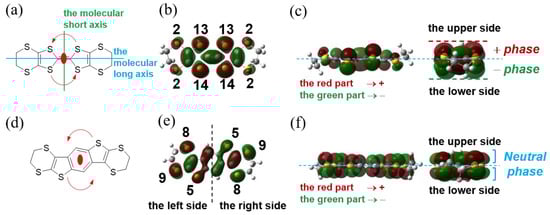 Figure 6 shows the phase (sign) symmetry of the HOMO for BEDT-TTF and BEDT-BDT. The HOMO phase of BEDT-TTF remains the same under the rotation operation. The shapes and phases of the HOMO are symmetrical with respect to both the long and short molecular axes. Therefore, the HOMO shape and phase have high symmetry. Regarding the HOMO, we focus on the sulfur atoms with d-orbitals that make substantial contributions to the intermolecular interactions. The HOMO of BEDT-TTF is localized at each sulfur atom, and the HOMO coefficient is particularly large at the sulfur atoms in the TTF skeleton [12]. Figure 6c demonstrates that the HOMO on the sulfur atoms at the TTF sites is larger than that on the carbon atoms. The HOMO above the sulfur atoms has the same phase, and the dominant HOMO phase in the molecular plane of BEDT-TTF is determined by the phase of the HOMO on the sulfur atoms in the TTF moiety. This property has been reported in previous studies [22,23]. This dominant HOMO phase is reversed with respect to the long plane of the molecule. For example, if the upper side of the molecular plane has a positive phase, the lower HOMO phase is negative. This is a characteristic of BEDT-TTF. However, the HOMO of BEDT-BDT has lower symmetry than that of BEDT-TTF because the only symmetry element is the rotation operation. The phase of the HOMO is inverted on the left and right sides of the central benzene ring. Because the positive and negative phases exist equally, there is no dominant phase throughout the molecular plane. That is, the sign of the HOMO is neutral on both the upper and lower sides of the molecular plane.