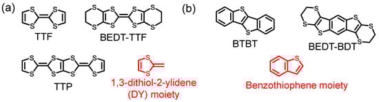 Molecular conductors have a rich phase diagram, including metallic, charge-density-wave, charge-ordering, spin-Peierls, spin-density-wave, and superconducting states [1]. In these organic conductors, the transfer integrals have a significant influence on the electronic characteristics. This occurs because the shapes of the molecular orbitals and the way they overlap determine the energy bandwidth and dimensionality of the electronic structure [2,3]. Generally, molecular conductors that have a one-dimensional (1D) electronic structure are prone to Peierls transition, which distorts their periodic structure [4]. Therefore, it is necessary to form a two-dimensional (2D) electronic structure to obtain a particular electronic state, such as superconductivity or a spin-liquid phase. The most successful example of this molecular strategy is bis(ethylenedithio)tetrathiafulvalene (BEDT-TTF), which is shown in Scheme 1a [5,6]. Due to the sulfur atoms in the ethylenedithio group, the molecular orbitals are expected to overlap not only in the stack direction but also between the stacks. The strain at the ethylene site at the end of the molecule prevents monotonic stacking. Thus, radical-cation (RC) salts using BEDT-TTF form >200 types of molecular conductors and realize a wide variety of electronic states [2]. Based on the success of BEDT-TTF, donor molecules with tetrathiafulvalene (TTF) and tetrathiapentalene (TTP) skeletons are frequently used in organic conductors, especially in RC salts [6]. The highest occupied molecular orbitals (HOMOs) in these molecules are largely localized on the sulfur atoms in the 1,3-dithiol-2-ylidene (DY) unit. Therefore, TTF and TTP derivatives have very similar HOMO shapes [5,7].