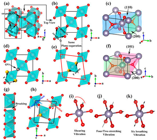 Section 3.1, the substitution of co-edge O atoms with F atoms in pairs would deteriorate the order and periodicity of the lattice in the c-axis direction due to the stretching of octahedral chains. Meanwhile, owing to the lack of co-point oxygen atoms, the non-connection and unconstraint among octahedral chains would further impair the periodic arrangement of octahedrons in the c-axis direction, and the crystalline cell also loses the stable squareness structure to transform into a rhombus, as shown in