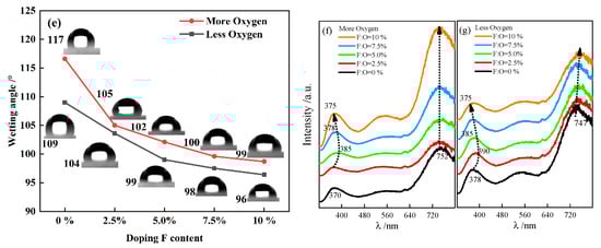 Figure 2e, under both strong and weak oxygen action, the wetting angle gradually decreases with the increase in the doped F content, indicating an increasing surface energy of film. It could be seen from the XRD pattern in