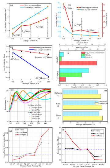 Figure 3a,b shows the trends in carrier concentration and mobility of films with the increase in the doped F content. Under the less oxygen atmosphere, as the doped F content increases, more F atoms could enter into the SnO