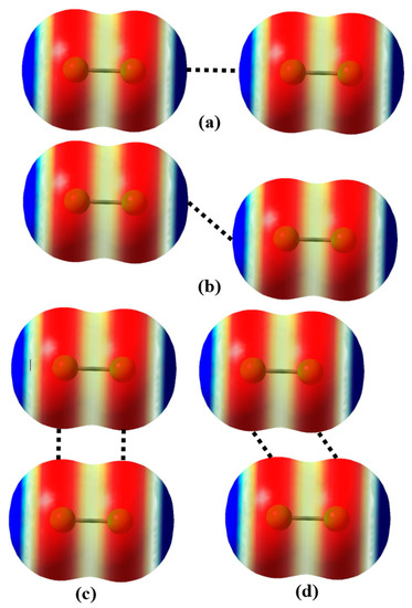Unlike the halogen bond or the other σ-hole bond, in which the electrophilic region of a σ-hole points to the nucleophilic region in another or the same molecular entity [16,17], the σ-hole⋯σ-hole stacking interaction is the net attractive interaction between two σ-hole regions with the similar electron-density distributions. Figure 1 is a simple schematic diagram of four different kinds of the σ-hole⋯σ-hole stacking interactions. In the Cambridge Structural Database (Version 5.42, February 2021) [18], the edge-to-edge σ-hole⋯σ-hole stacking interactions shown in Figure 1 are seldom found. Hence, in this study, we only focused on the face-to-face σ-hole⋯σ-hole stacking interactions. Let us stress here that the use of the term “σ-hole⋯σ-hole stacking interaction” is reasonable because the two σ-holes with similar electron-density distributions are stacked with each other, which leads to the stacking of the two σ bonds and further the stacking of the two molecules. Evidently, the σ-hole⋯σ-hole stacking interaction is totally different from the halogen⋯halogen or chalcogen⋯chalcogen interaction. The σ-hole⋯σ-hole stacking interaction is defined according to the electron-density distribution, whereas the halogen⋯halogen or chalcogen⋯chalcogen interaction is judged in terms of the molecular geometries. It is also unsuitable to use the term “like-charge interaction” to describe such kind of net attractive interaction because the charge is neither a physical observable nor a strict mathematical formulation and many atoms in the molecules have both the negative electrostatic potential region and positive electrostatic potential region.