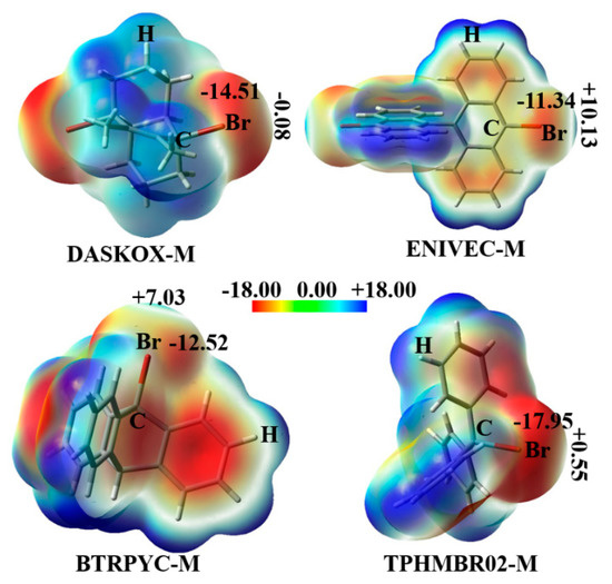 Figure 2 shows the PBE0-D3(BJ)/def2-TZVPP molecular electrostatic potential maps of the monomers DASKOX-M, ENIVEC-M, BTRPYC-M, and TPHMBR02-M. The existence of the σ-hole of the Br atom in each monomer is very clear. As pointed out earlier by Politzer and Murray, the σ-hole is a region of lower electronic density on the extension of a σ bond and it is incorrect to assume that a σ-hole has only the positive electrostatic potentials [41]. Therefore, the σ-holes of the Br atoms can be either negative or positive. Both the negative and positive σ-holes can be seen in Figure 2, although the absolute values of the surface maxima of the σ-holes of the Br atoms in DASKOX-M and TPHMBR02-M are not very large.