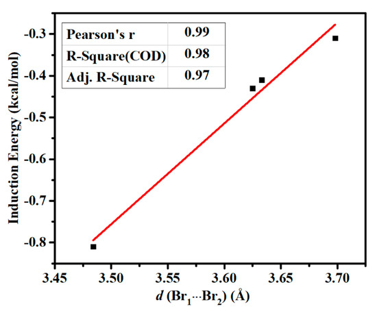 The contribution of each energy component to the total attractive energy can be clearly seen in Table 1. The dispersion energies contribute about 70% of the total attractive interaction energies. This means that the face-to-face σ-hole(Br)⋯σ-hole(Br) stacking interactions are dispersion-dominated, which is in good agreement with previous finding for the σ-hole(I)⋯σ-hole(I) and σ-hole(S)⋯σ-hole(S) stacking interactions [15]. The electrostatic energies and induction energies contribute 10% to 19% of the total attractive interaction energies. Unlike the other dispersion-dominated complexes in which the electrostatic energies always play secondary roles for their stabilities, here in the four dimers the contribution of the induction energy to the total attractive energy is close to or even larger than that of the electrostatic energy. Figure 4 shows the correlation of the induction energies with the interatomic distances. The values of the Pearson’s correlation coefficient, coefficient of determination, and adjusted correlation coefficient are all close to 1.00. Evidently, there is a strong correlation between the induction energy and the interatomic distance. The absolute values of the induction energies are inversely proportional to the Br1⋯Br2 interatomic distances. In Table 1, the contribution of the induction energy to the total attractive interaction energy of the dimer BTRPYC-D is the smallest one and the contribution of the induction energy to the total attractive interaction energy of the dimer TPHMBR02-D is the largest one. This is reasonable because the Br1⋯Br2 distance in the dimer BTRPYC-D is the longest one and the Br1⋯Br2 distance in the dimer TPHMBR02-D is the shortest one.