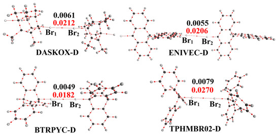 To further explore the nature of the σ-hole⋯σ-hole stacking interaction, AIM analysis has also been carried out for the four dimers DASKOX-D, ENIVEC-D, BTRPYC-D, and TPHMBR02-D. The AIM theory is based on a topological analysis of the electron charge density and its Laplacian. Figure 5 shows the molecular graphs with the values of electron densities and their corresponding Laplacians at the bond critical points of the Br1⋯Br2 contacts for the dimers DASKOX-D, ENIVEC-D, BTRPYC-D, and TPHMBR02-D. For clarity, only the bond critical points are shown and the ring critical points are omitted. The values of the electron densities at the bond critical points of the Br1⋯Br2 contacts range from 0.0049 to 0.0079 au, and the values of their corresponding Laplacians range from 0.0182 to 0.0270 au. According to Bader’s AIM theory, for the closed-shell interactions (van der Waals interactions, hydrogen bonds, and ionic bonds), the values of the electron densities at the bond critical points are relatively small and their corresponding Laplacians are positive [34]. Evidently, the Br1⋯Br2 contacts in the dimers DASKOX-D, ENIVEC-D, BTRPYC-D, and TPHMBR02-D are all of the noncovalent interactions. As shown in Figure 5, except for the σ-hole(Br)⋯σ-hole(Br) stacking interactions, there are no other noncovalent interactions in the four dimers. Being consistent with the conclusions in Section 3.1, the results of the AIM analyses also rule out the possible effects of other noncovalent interactions.