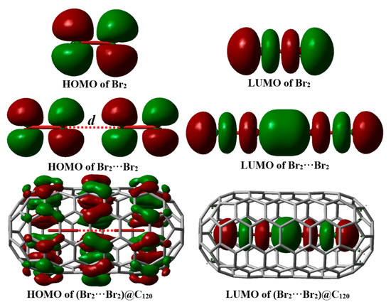 Figure 6 shows the optimized configurations, the highest occupied molecular orbital (HOMOs), and the lowest unoccupied molecular orbitals (LUMOs) of Br2, Br2⋯Br2, and (Br2⋯Br2)@C120. Table 2 summarizes the Br-Br bond lengths, Br⋯Br interatomic distances, formation free energies, HOMO energies, LUMO energies, and LUMO–HOMO energy gaps, of Br2, Br2⋯Br2, and (Br2⋯Br2)@C120, calculated at the PBE0-D3(BJ)/def2-TZVPP level of theory. The optimized Br-Br bond length of Br2 is 2.2817 Å, which is in excellent agreement with the experimental value of 2.2811 Å [46]. The Br-Br bond length becomes much longer upon the formation of (Br2⋯Br2)@C120. The Br⋯Br interatomic distance is 3.8296 Å in the dimer Br2⋯Br2 and becomes much shorter as the dimer Br2⋯Br2 is encapsulated into C120. The face-to-face configuration of Br2⋯Br2 is not the local or global minimum on the potential energy surface, which is consistent with its positive formation free energy. However, (Br2⋯Br2)@C120 is quite stable, and its formation free energy is −77.84 kcal/mol. This means that, even in the gas or liquid phase, the face-to-face σ-hole⋯σ-hole stacking interactions can be easily observed in the complexes confined in small spaces.