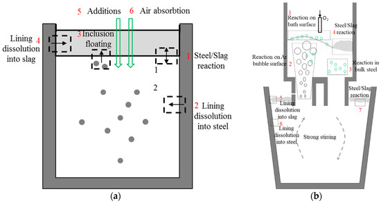 The modeling work was based on the coupling of the mass transfer of steel/slag, inclusions, and lining material into the EERZ with thermodynamic databases. The thermodynamic library—ChemApp—was applied to link the source code to the database from FactSage or self-optimized ones [12,13]. The source code was programmed in FORTRAN. In the model, thermodynamic databases were applied to perform the multiphase equilibrium calculation. The EERZ method was used to describe the kinetics of the reactions [2]. Figure 1 displays the schematics of the LF and RH process models. As shown in Figure 1a, the following reactions and phenomena are considered for LF refining: (1) steel/slag reaction, (2) lining dissolution to steel, (3) inclusion floating, (4) lining dissolution into slag, (5) alloy additions, (6) and air absorption. In the steel/slag reaction, the mass transfer coefficient of steel was calculated by Equations (1) and (2) [14]; the slag’s mass transfer coefficient was assumed to be one tenth of the value for steel [14]. The inclusion floating rate (3 in Figure 1a) was estimated using Equations (2) and (3) [15]. The inclusion removal rate was further modified by multiplying the exponent item () to consider the influence of the inclusion content. It was assumed that the inclusion could not be removed when its content () was lower than the critical value ().The mass transfer coefficient and the inclusion floating rate are stirring dependent, which is also assumed for the RH refining process. Lining dissolution (2 and 4 in Figure 1a) and air absorption (6 in Figure 1a) are simply accounted for by empirical rate factors.