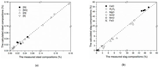 The comparison of the calculated and measured final compositions in (a) steel (b) slag after LF refining (“[]” indicates dissolved value) [15,16].