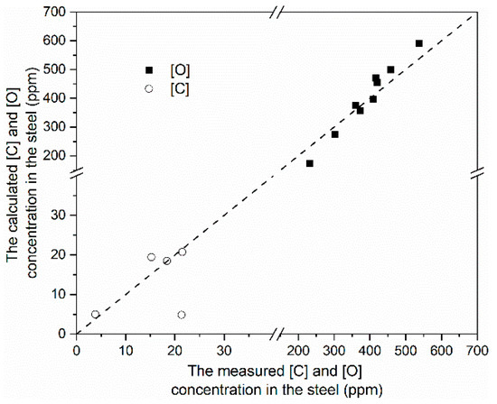 The comparison of the calculated and measured [C] and [O] concentrations during the RH treatment (“[]” indicates dissolved value) [2,9].