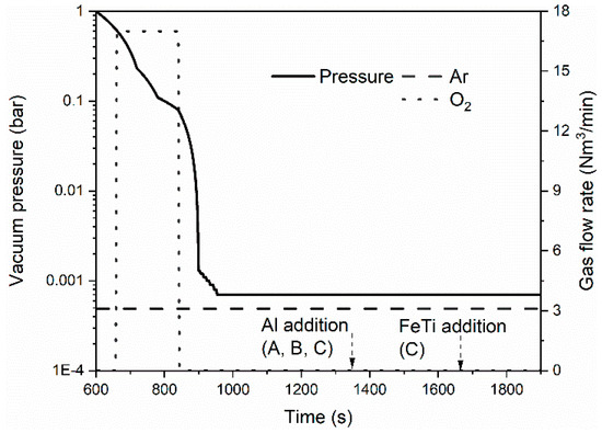 For the simulations, the steel and slag compositions before the refining were assumed as listed in Table 1. The Fe concentration was 99.772 in mass percent (% mass). Note that the steel and slag were not necessarily in an equilibrium state before refining. Table 2 lists the mass of steel, slag, and the additions in the different simulations. Simulation A was performed under the assumption of only Al deoxidation after RH, while simulation B was performed with the addition of 80 kg carbon for pre-deoxidation during tapping and less Al addition to achieve a similar final Al concentration in the steel; simulation C was designed to study the influence of FeTi addition. The defined mass of Al addition was to acquire approximately 0.04% Al in steel after deoxidation, and Ti concentration was assumed to be close to that of Al by alloying. The ladle size was chosen to be 270 tons, and the ladle treatment and the RH refining process for the three cases were simulated. The stirring with Ar was also considered, assuming a constant flow rate of 1.2 N·m3/min overall for the LF refining process. The mass of steel in the RH vessel was chosen as 21 tons based on the numerical simulation, which is specific to the RH process at POSCO Gwangyang Work [2]. When the RH construction (e.g., size) changes, the steel content in the RH chamber will vary. The LF refining time for all the simulations was 600 s (10 min). The RH treatment time was 1000 s for simulation A, whereas the refining time was 1300 s (21.7 min) for simulations B and C. As tapping was not considered in the simulations, carbon was added at the beginning of the LF process (5 s). Al was added at 1320 s (22 min), which was 720 s (12 min) after the RH refining, and FeTi was alloyed at 1680 s (28 min) (360 s after Al deoxidation), as shown in Figure 4 [17]. Figure 4 also displays the assumed changes in pressure in the vacuum vessel and the flow rate of lifting gas and blowing oxygen during the RH process, which referred to the published data from Van Ende et al. [2]. The oxygen blowing was performed to between 660 s (11 min) and 840 s (14 min) at a rate of 17 N·m3/min. All the modeling parameters used for the following simulations were the same. Note that the steel/slag reaction in the vacuum vessel (reaction 4 in Figure 1b) was ignored because the slag was transported back to the ladle within a short time of the treatment.