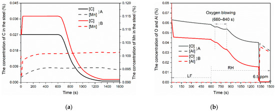 Comparing the steel compositions in the refining process (a) [C] and [Mn]; (b) Al and O (“[]” indicates dissolved value).