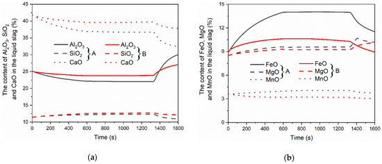 Comparing the slag compositions in the refining process (a) Al2O3, SiO2, and CaO; (b) FeO, MgO, and MnO.