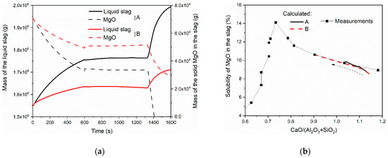 Comparing (a) the mass of slag phases and (b) MgO solubility in the liquid slag [21].