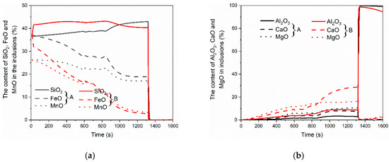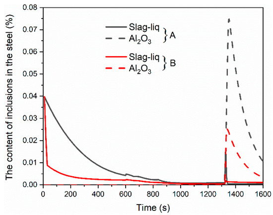 Figure 8 and Figure 9 display the comparison of the inclusion content and the overall inclusion composition during the refining process for simulations A and B. From Figure 8, it is found that the pre-deoxidation in simulation B significantly reduced the inclusion content in the refining process. At the beginning of the refining process, the added carbon in simulation B reduced the formed Slag-liq inclusions by approximately 0.03% and led to the removable CO formation. The residual inclusions were gradually removed in the subsequent process. Al deoxidation resulted in Al2O3 content’s sharp increase, whereas the content of Al2O3 in simulation B was much lower because of the lower [O] concentration (Figure 5b). The final inclusion contents in simulations A and B were 0.0114% and 0.0040%, respectively. Figure 9 shows that the inclusion’s (Slag-liq) principal components were SiO2, FeO, MnO, CaO, MgO, and Al2O3 before Al addition. FeO and MnO contents in simulation A were higher than those in simulation B because of its higher [O] concentration, whereas the other components were lower in content. FeO and MnO contents gradually decreased during the refining process, whereas CaO, MgO, and Al2O3 contents increased due to the steel/slag reaction. After Al deoxidation, the Al2O3 content accounted for more than 95%.