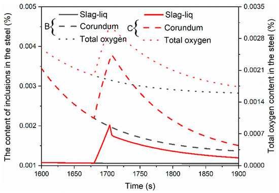 In this section, the influence of FeTi addition on steel cleanness was studied. As listed in Table 2, simulation C with an FeTi addition at 6 min after Al deoxidation was carried out. The composition of the FeTi alloy in the simulation was assumed as 70%Ti-3%O-2.5%Al-24.5%Fe [26]. The predicted chances of inclusion and total oxygen (Otot) in simulations B and C are compared in Figure 10. Note that only the results after 1600 s are displayed, and the results in the former refining process can be referred to in Figure 8. The FeTi addition had a minor influence on the compositions of steel (except [Ti]) and slag. Hence, only the inclusion content is discussed in this section. From Figure 10, it is found that FeTi addition significantly increased the content of inclusions and Otot, which is attributed to the relatively high O content of FeTi. The peak content of Otot was almost doubled by FeTi addition. Corundum is the dominant inclusion type, and Slag-liq also exists in both simulations, while the compositions of the inclusion phase in different simulations were different, as listed in Table 3. The Slag-liq composition without FeTi addition (simulation B) was 77%Al2O3-10%CaO-13%MgO, and it was modified to 59%Al2O3-5%CaO-12%MgO-17%Ti2O3-7TiO2 by FeTi addition. Meanwhile, Al2O3 was transformed to the corundum solution phase with the composition of 99.2%Al2O3-0.8%Ti2O3. Note that the thermodynamic equilibrium between steel and inclusion was assumed in the present model, though it is not the case in reality when considering the kinetics. Nevertheless, the inclusion composition changes in the simulations indicate that the formed inclusions are transformed to some extent besides the newly formed inclusions.