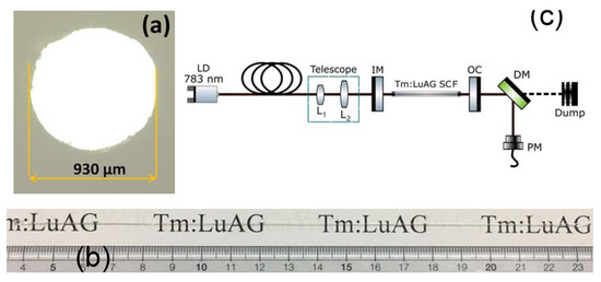 The experimental setup of the Tm:LuAG SCF laser is schematically shown in Figure 1c. The pump source was a fiber-coupled (100-μm core with NA = 0.22) laser diode delivering a maximum power of 25 W at 783 nm with a measured beam quality, i.e., M2-factor of 34. The pump beam was focused into the crystal by a coupling lens system, where L1 with a focal length of 25.4 mm was used to collimate the pump light, and L2 with focal lengths of 30, 50, and 75 mm was used to focus the pump beam into the Tm:LuAG SCF with beam spot diameters of ~116, 196, and 294 µm. The input mirror (IM) has a high transmission of about 99% at pump wavelength and high reflection of more than 99.9% at the lasing wavelengths. Several output couplers (OCs) with transmission of 3%, 5%, 10%, and 14% were used to explore the best laser performance. A 20-mm-long Tm:LuAG SCF cutting from the fabricated entire SCF was used as the sample for the laser operation. To avoid the Fresnel reflection, both its end faces were polished and anti-reflection coated. We have directly measured the single-pass propagation loss using a He–Ne laser and high-sensitive power meter, giving a loss of 0.048 cm−1. The SCF was mounted in a home-made aluminum module and directly water-cooled to 15 °C. A dichroic mirror (DM) was used as a beam splitter for pump and laser beams.