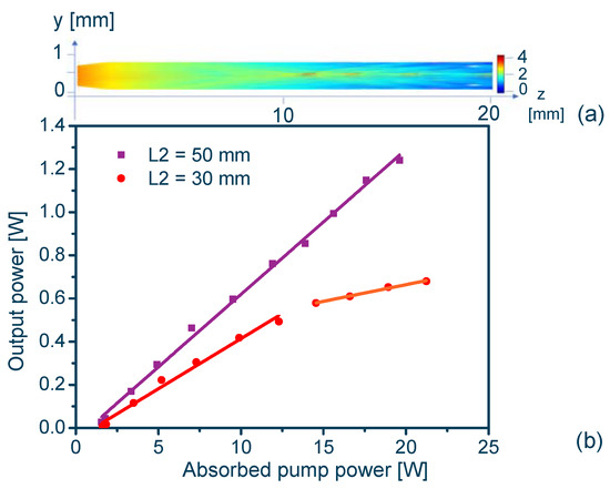 At first, laser performances with different pump-guiding conditions were investigated. In this case, the focused beam diameters in the SCF were 116 and 196 µm, exhibiting depths of focus of ~0.8 and ~2.4 mm, respectively. The large divergence angle (0.15 and 0.05) made it easy to realize the pump-guiding. Using ray tracing analysis [13], the stimulated spatial distribution of pump light (with L2, f = 30) in the SCF is shown in Figure 2a. The pump-guiding mode can be clearly seen. For the beam diameter of 196 µm, the maximum output power was 1.24 W with a slope efficiency of 6.7% at an absorbed pump power of 19 W, higher than that of 0.68 W and 4.6% obtained with the beam diameter of 116 µm. For the latter case, the output power rose slowly with the slope efficiency of 1.5% when the absorbed pump power was beyond 15 W. It seems that the intense pump-guiding gave a worse laser performance in our case with the 20-mm-long Tm:LuAG SCF, which failed to meet our expectations on pump guiding as that in the traditional glass fiber lasers.