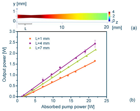 Thus, mode-matching may still be a critical factor for power scaling in such relatively short SCF, and thereafter, pumping configuration with a spot diameter of 294 µm was employed, which in principle has a better mode-matching with the fundamental laser mode (~300 µm beam diameter) along the SCF. In this case, the focused pump beam had a depth of focus of ~6 mm, and thus the position of the focal point in the SCF became a critical parameter. Figure 3a shows the stimulated spatial distribution of pump light in the SCF. In the present work, L = 1, 4, 7 mm (distance between the input end facet and focal point), with free propagation of 10, 13, 16 mm in the SCF, was performed for the CW regime. The laser performances for the three pumping configurations were investigated with a physical cavity length of ~2 cm and a 10% OC, as shown in Figure 3b. The maximum output powers for the three cases were 2.16, 2.44, and 1.91 W, corresponding to the slope efficiency of 10.2%, 11.7%, and 8.19%. The case of L = 4 mm has the best laser performance and lowest laser threshold, which indicates a trade-off between mode-matching and pump guiding is essential for the present Tm:LuAG SCF laser.