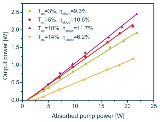 The CW laser operation for different OCs with a pump beam diameter of 294 μm for the L = 4 mm was thereafter studied in detail. Figure 4 shows the output power with respect to the absorbed pump power. For various OCs, the output power reaches the highest 2.44 W with the 10% OC, and decreased sharply to 1.18 W as the transmittance of the output coupler increased to 14%. The slope efficiency measured this time is much lower than in a previous report about Tm:YAG lasers using a thick rod [14] (50%), and also lower than the Tm:YAG crystal [12] (39.1%) grown by using the µ-PD technique in which the 790-nm LD was used as pump power. The relatively low concentration of Tm3+ doped may be responsible for the low slope efficiency. We know that high Tm concentration doped was important to realize two-for-one cross-relaxation. Normally, materials with 4.0 at.% Tm doped were used for laser operation [9,10], while just 2.0 at.% Tm doped was used in our experiments. The detailed data are also shown in Table 1.