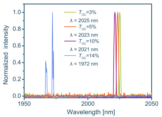 Figure 5 shows the laser spectrum of the Tm:LuAG SCF with different OCs. The peak wavelength changed from 2025 nm to 1972 nm. The wavelength red-shift with decrease of the OCs is caused by the enhanced reabsorption effect with lower OC transmission, where a higher population inversion is needed, resulting in a drift of gain spectrum [15]. It is obvious that the multiple wavelengths occurred and the peak wavelength blue-shift rapidly when the OCs increased from 10% to 14%. The change of gain cross sections may be responsible for this phenomenon [16]. Unfortunately, the gain cross section of the Tm:LuAG SCF cannot be depicted for the uneven concentration around the end facet of Tm:LuAG SCF grown by the µ-PD technique [17].