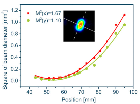 The beam profile was also measured at an output power of 2 W by using two plano-convex spherical lens (L3, f = 150 mm, L4, f = 100 mm) and a beam profiler (WinCamD-IR-BB, Dataray Inc). The M2 at two directions were measured to be 1.67 and 1.10 in the x- and y-directions, as shown in Figure 6. The relatively larger M2 value along the x-axis is caused by the slight misalignment between the pump and oscillation in this axis, which would introduce more high-order mode. The transverse-mode also can be observed from the 2D beam profile. This phenomenon can be understood since our cavity was plano–plano and no extra transverse-mode-limiting optical elements were applied [16].