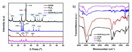 As depicted in Figure 1b, the absorption peak at 606 cm−1 is assigned to the characteristic peak of CdS and Bi2S3. BiOBr, Bi2S3 and CdS samples displayed a similar spectrum and possessed the same peak at about 1400 cm−1, 1630 cm−1 and 3400 cm−1. All the characteristic peaks above appeared in BiOBr/Bi2S3/CdS, indicating that part of BiOBr was successfully vulcanized into Bi2S3 and CdS was successfully loaded.