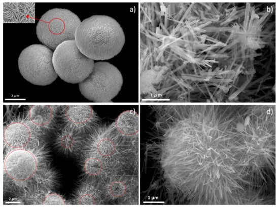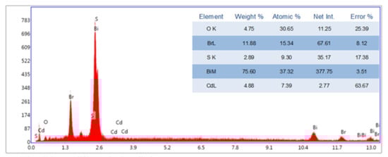 The SEM images of BiOBr, Bi2S3 and BiOBr/Bi2S3/CdS to determine the morphology of the composite are shown in Figure 2. From Figure 2a, the prepared pure BiOBr has a microsphere structure with an average diameter of 3.5 μm. The partially enlarged view shows that BiOBr microspheres are formed by stacking many BiOBr nanosheet structures. Figure 2b shows the pure Bi2S3 with a typical needle-like structure. Figure 2c,d clearly illustrate that the composite BiOBr/Bi2S3/CdS has a sea urchin-like structure. The red indicated area is mainly the microsphere structure retained by BiOBr, and some of the microspheres show a cavity structure due to more complete vulcanization. The needle-like structure grown on the microsphere structure is mainly composed of Bi2S3 formed by vulcanization and a small amount of CdS. In addition, the irregular surface shape of the microsphere structure is mainly due to the adhesion of CdS nanoparticles on parts of the BiOBr crystal surface []. Figure 3 shows the selected area EDS results of the composite BiOBr/Bi2S3/CdS, where the selected area is the one shown in Figure 2d. The content of the five elements Bi, Cd, Br, S and O in the composite material basically meets the expectations of the composite material, which further confirms the successful preparation of the material.