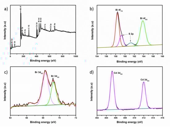 XPS was applied to further analyze the chemical state of the sea urchin-like BiOBr/Bi2S3/CdS material, and the results are presented in Figure 4. The full measurement spectrum in Figure 4a shows the strong characteristic peaks of Bi, Cd, O and Br and the weak characteristic peak of S, thus confirming the existence of Bi, Cd, O, Br and S in BiOBr/Bi2S3/CdS. The peak near the binding energy of 227.6 eV is attributed to S 2s, which indicates the presence of S2− in the complex. The two strong peaks at 164.6 eV and 159.3 eV shown in Figure 4b can be attributed to Bi 4f5/2 and Bi 4f7/2 of Bi3+ in BiOBr/Bi2S3/CdS and the two peaks at 159.2 eV and 161.3 eV can be attributed to S 2p [,]. It was confirmed that the precursor BiOBr was sulfided to form Bi2S3, a trivalent sulfide of Bi. The strong peaks at the binding energy of 68.3 eV and 69.3 eV shown in Figure 4c belong to the Br 3d5/2 and Br 3d3/2 orbital, which is consistent with the XPS results of Br in the BiOBr report in the literature []. The Cd 3d orbital in Figure 4d shows the electronic binding energy of Cd 3d5/2 at 405.05 eV and 411.7 eV. The characteristic peaks at these two positions have been proved to belong to CdS []. It shows that there is Cd2+ sulfide CdS in the composite material. The above XPS results verify that the composition and valence of each component of sea urchin-like BiOBr/Bi2S3/CdS are in line with expectations.
