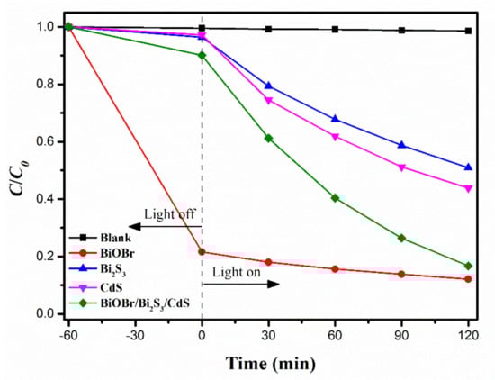 The photocatalytic activity of the BiOBr/Bi2S3/CdS composite material was evaluated by degrading MeB solution under an indoor metal halide lamp. Figure 5 shows the experimental results of visible light catalytic removal of MeB in the presence of pure BiOBr, Bi2S3, CdS and BiOBr/Bi2S3/CdS complexes. MeB is usually relatively stable under the irradiation of metal halide lamps, so the self-photolysis effect is negligible. Dark treatment showed that pure BiOBr, Bi2S3, CdS and BiOBr/Bi2S3/CdS composite materials had a certain adsorption capacity, especially BiOBr spheres with a large specific surface area have a strong adsorption effect on MeB dye and almost reach equilibrium within 60 min. The efficient adsorption of BiOBr for dyes was similar to other researches []. After 120 min of subsequent exposure to the metal halide lamp, pure Bi2S3, CdS and BiOBr/Bi2S3/CdS all produced a certain degree of removal performance for MeB. Among them, the BiOBr/Bi2S3/CdS composite photocatalyst can achieve 83.3% degradation efficiency of MeB dye. This showed that BiOBr/Bi2S3/CdS composite material can efficiently remove MeB dye contaminants under visible light.