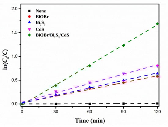 where C0 and C are the initial concentration of the dye solution and the concentration of the dye solution at different times, k and t are the rate constants of the system and the time. The result is shown in Figure 6. The degradation of MeB by each material follows a pseudo-first-order kinetic model, and BiOBr/Bi2S3/CdS has the largest reaction rate. Table 1 contains the rate constants and correlation coefficients of the pseudo-first-order kinetics of each photocatalyst. It can be seen that compared to the original BiOBr, Bi2S3 and CdS photocatalysts, the reaction rate of the BiOBr/Bi2S3/CdS composite for MeB degradation has increased by 1.96, 1.67 and 1.14 times, respectively.