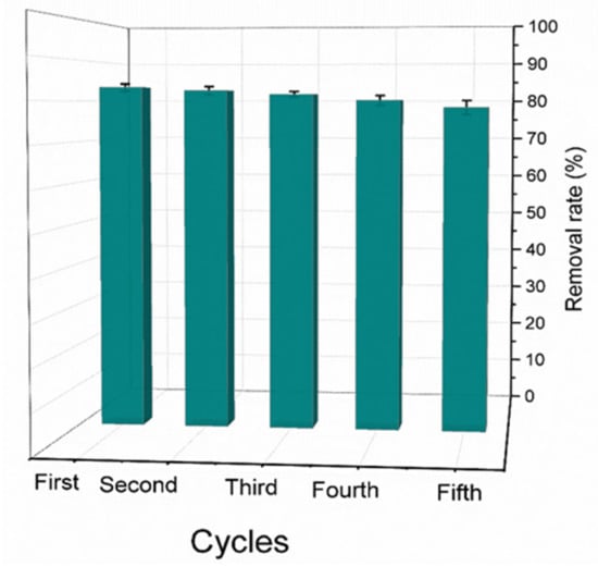 Five continuous degradation cycles in presence of BiOBr/Bi2S3/CdS composite photocatalyst were studied. As shown in Figure 7, after the fifth cycle the degradation efficiency of MeB remained at about 78.4% and the catalytic efficiency of the catalyst decreased by only 4.9%. This indicates that the sea urchin-like BiOBr/Bi2S3/CdS composite has excellent stability under the MeB degradation.
