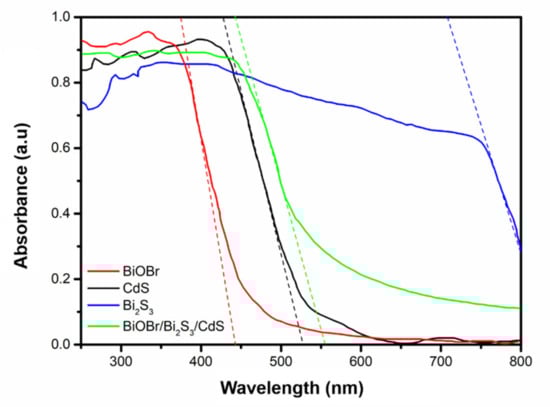 The optical properties of pure BiOBr, Bi2S3, CdS and BiOBr/Bi2S3/CdS composite materials were verified by UV-Vis, and the results are shown in Figure 8. It can be seen that pure BiOBr has a small amount of absorption at the edge of the visible light region, while CdS can absorb light in a larger range than BiOBr. Bi2S3 is different from them, its absorption range covers the entire ultraviolet and visible light regions. Studies have shown that as the vulcanization duration increases, the absorption edge of the composite material formed by BiOBr gradually shifts to a longer wavelength, which indicates that the introduced Bi2S3 has a strong visible light response []. Therefore, the absorption edge of the BiOBr/Bi2S3/CdS composite shifts to higher wavelengths, and it also exhibits a certain intensity of absorption of visible light at higher wavelengths. This fully shows that the introduction of Bi2S3 and CdS increases the visible light utilization rate of the original BiOBr, thereby improving its photocatalytic efficiency. Subsequently, in order to more accurately understand the changes in the light absorption characteristics after recombination, the band gap energy Eg of each substance was calculated using the intercept method. The calculation formula of Eg is as follows (Equation (3)) []: