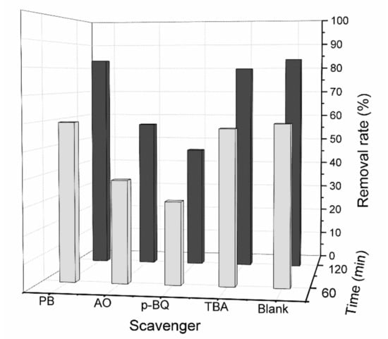 Some reactive species, including holes (h+), photo-generated electrons (e−), superoxide radical anions (•O2−) and hydroxyl radicals (•OH), have successfully separated the degradation of organic pollutants after generating photogenerated charge carriers on the surface of light and photocatalyst []. In order to reveal the reactive species in the process of dye degradation, trap-trap experiments were carried out with 1 mM tert-butyl alcohol (TBA), p-benzoquinone (p-BQ), ammonium oxalate (AO) and potassium bromate (PB). TBA, P-BQ, AO and PB were used to capture •OH, •O2−, h+ and e−, respectively [,]. Figure 9 shows the changes in MeB degradation in the presence of various scavengers. After the introduction of p-BQ and AO, the two-hour removal rate dropped visibly. However, the effect of introducing TBA and PB on the removal of MeB by the catalyst is negligible (close to blank). These results indicate that the superoxide radical •O2− and h+ are the main substances produced by BiOBr/Bi2S3/CdS under visible light, and they subsequently degrade MeB. To verify the experimental results of free radical generation, EPR spin trapping was used []. The result is shown in Figure 10. Under visible light, the use of BiOBr/Bi2S3/CdS catalyst to degrade MeB was recorded with a strong DMPO-•O2− signal. This proves that in addition to the known h+, the composite catalyst can also produce •O2− as a reactive substance under visible light.