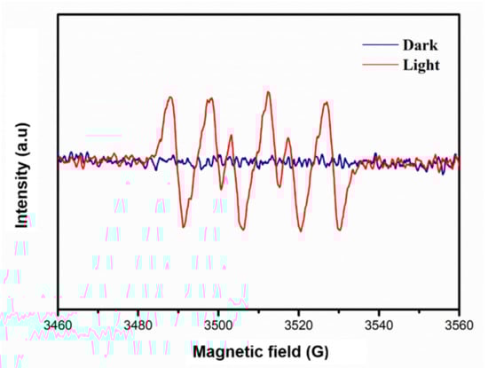 DMPO spin-trapping EPR spectra of •O2− in MeB solution under dark conditions and visible light irradiation.