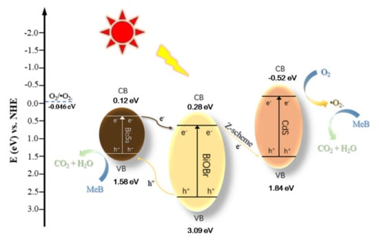 Since BiOBr is a p-type semiconductor, its Fermi level is close to its valence band, while CdS and Bi2S3 are n-type semiconductors, and its Fermi level is close to its conduction band. Therefore, the contact between the semiconductors and the balance of the Fermi level lead to the formation of p-n heterojunctions. This can be achieved by the upward shift of the Fermi level of BiOBr and the downward shift of the Fermi level of CdS and Bi2S3. The balance of the Fermi energy level causes the VB and CB of CdS and Bi2S3 to move positively, while the VB and CB of BiOBr move negatively. BiOBr, Bi2S3 and CdS are all visible active photocatalysts. Therefore, continuous visible light irradiation of the BiOBr/Bi2S3/CdS composite causes BiOBr, Bi2S3 and CdS to form charge carriers. However, because the VB of BiOBr is in a more positive position than the VB of Bi2S3, the holes in the VB of Bi2S3 degrade MeB, while the electrons on the CB of Bi2S3 transfer to the CB of BiOBr, hindering its reorganization. On the other hand, the width of the CB of CdS makes the electron light excited to a higher CB, and the annihilation of the h+on the VB of CdS and the electron (e−) on the CB of BiOBr on the conductive medium also reduces the recombination, and the CB of CdS. The e− at the place reacts with O2 to generate •O2− for further degradation of MeB []. In addition, because the CB of BiOBr and Bi2S3 cannot reach the formation potential E0 of •O2− (O2/•O2−= −0.046 eV), the recombination of CdS with a more negative CB plays a key role in the generation of superoxide radicals. In summary, the photo-induced carrier transfer process and MeB removal process at each stage of the photocatalytic process are shown in formula (Equations (6)–(12)) []: