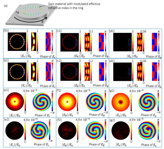 Figure 1 presents the details of the standing waves in the cavity and the emitted modes for . Here, the laser cavity with is taken as an example, and the z-direction mode number and radial mode number of the cavity mode are fixed. The , , and show obvious nodes along the azimuthal direction of the ring [Figure 1(b1)–(d1),(b2)–(d2)], which is the typical character of the standing wave modes. Besides, the standing-wave nature of the cavity modes is further confirmed by the phases of , , and of the cavity modes (the last figures of the Figure 1(b1)–(d1),(b2)–(d2)). Because the cavity mode is coupled into the emitted OAM light by the tiny perturbations in region 1, mode 1 and mode 2 with different distributions in the cavity exhibit distinct emission characteristics. For mode 1, the azimuthal antinodes of (the dominant component of the electric field) match the sections of region 1 (Figure 1(b1),(d1)). Besides, the phase of the of mode 1 in each individual section of region 1 is the same, and the of mode 1 has a phase difference between adjacent sections of region 1 (Figure 1(b1)). Thus, mode 1 is coupled to the desired OAM mode as shown by Figure 1(e1)–(g1), in which the , and all show phase characteristics of the OAM light. For mode 2, only the azimuthal antinodes of match the sections of region 1 (Figure 1(c2)), while the azimuthal antinodes of and match the sections of region 2 [Figure 1(b2),(d2)]. Besides, the , , and of mode 2 in each individual section of region 1 all simultaneously contain mode oscillations with opposite phases. Thus, the emission from mode 2 to the OAM mode is suppressed as shown in Figure 1(e2)–(g2) (the intensity of mode 1 and mode 2 in the cavity is nearly the same. However, compared with the bright color of the emitted light from mode 1 (Figure 1(e1)–(g1)), the emitted light from mode 2 (Figure 1(e2)–(g2)) shows a nearly dark color, indicating the suppression of the emitted light from mode 2.) This property will help suppress unwanted components in the emitted light.