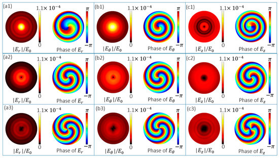 Tuning the OAM of the emitted light. The first row [(a1)–(c1)], second row [(a2)–(c2)], and third row [(a3)–(c3)] of the figure present the simulation results of the modes for = 1, 2 and 3, respectively. These results are in the cross section (the radius of the area is 5000 nm) of the emission modes at above the upper surface of the cavity. It is worth noting that the corresponding modes inside the cavity (mode 1) have nearly the same field intensity.