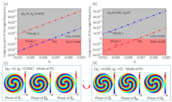 where the tiny perturbations and will couple the standing-wave WGMs with into the desired OAM light. Because the oscillations of the standing-wave WGMs jump a phase at each amplitude node, a is needed in the term . . The OAM carried by the emitted light is related to . The and can be controlled by tuning the real and imaginary part of the perturbation terms. Researchers have explored some methods to modulate the effective dielectric constant or effective refractive index [34,35]. The loss can be used to suppress the lasing of the competing modes. It is worth noting that the is not required. However, in order to facilitate the practical effective refractive index modulations, is used in our theoretical model. In this case, and () can be achieved without resorting to gain and negative real parts. In this paper, we adopt the following definition: the material corresponds to loss material when the imaginary part of the refractive index of the material is positive.