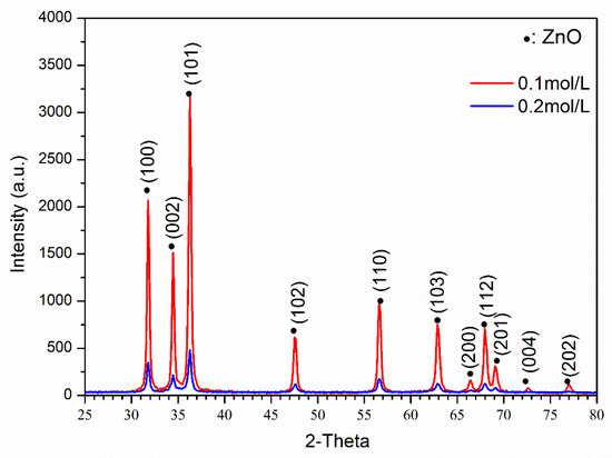 Figure 2 shows the XRD results of ZnO powder with different precursor concentrations. It was found that both samples had a pure ZnO phase without any other peaks (PDF#89-0511). However, the 0.1 mol/L precursor concentration sample had a much higher peak intensity than the 0.2/L sample, and both samples were measured under the same conditions. Moreover, the FWHM values of the ZnO (100) and (101) peak was used to evaluate the crystallinity. The FWHM values of (100) and (101) peaks of 0.1/L sample are 0.28°/0.26°, and 0.40°/0.39° for 0.2/L sample, respectively. Thus, the low peak intensity and large FWHM indicate that the 0.2 mol/L sample had a much worse crystallinity. To obtain good infrared absorption results, the crystallinity of ZnO or Zn1−xFexO should be as high as possible.