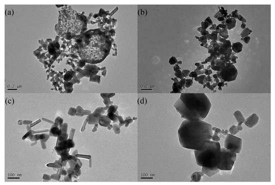 Figure 3 shows TEM images of ZnO powders with different precursor concentrations, demonstrating a significant difference in the microstructures of the samples. Both samples have two types of particles: large spheres and small particles. This shows that both the liquid–particle route (large sphere) and gas–particle route (small particles) exited during FAS [6]. However, the spheres were hollow in the 0.1 mol/L precursor concentration sample but solid in the 0.2 mol/L sample. More importantly, as shown in Figure 3c,d, most of the small particles in the 0.1 mol/L sample have a rod-like shape. However, none of the particles in the 0.2 mol/L sample showed such a shape. Moreover, the particle size in the 0.2 mol/L sample was also significantly larger than that in the 0.1 mol/L sample.