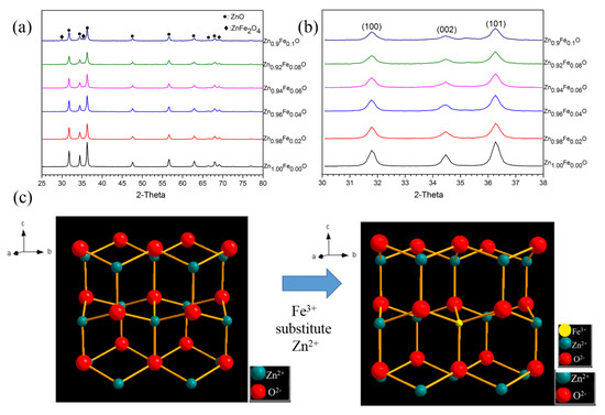 (a,b) XRD results of the Zn1−xFexO powders with different Fe amounts; (c) a sketch of the Zn(Fe)O crystal structure.