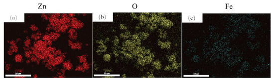 As shown in Figure 4, Fe doping can significantly change the lattice parameters of ZnO and may further affect infrared absorption. However, it is worth further confirming the actual Fe doping in the sample after the FAS process to test if there is element loss or segregation. Figure 5 shows the EDS mapping results of the Zn0.92Fe0.08O powder. There is no apparent segregation from the mapping results, which shows that Fe doping is homogenous. The statistics atomic ratio between Zn and Fe from the EDS is 91.7:9.3, near the Zn0.92Fe0.8O. However, it is worth mentioning that the EDS is not very accurate in characterizing the element ratio quantitatively. So furthermore, accurate characterization is still needed.