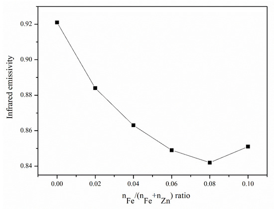 Figure 6 shows the infrared emissivity results of Zn1−xFexO powders with different Fe amounts. Infrared emission was significantly suppressed with increasing Fe content. Because the samples’ microstructures are the same, the apparent difference in the infrared emission originates from the crystal structure. Both Fe-O and Zn-O are ionic crystals, and when Fe3+ is substituted with Zn2+, lattice deformation occurs in the ZnO crystal cell. Lattice deformation releases free electrons, which can absorb infrared waves. The more the amount of Fe added, the greater is the substitution of Zn. In addition, more lattice deformation caused high infrared absorption or low infrared emission. When Fe addition reached its threshold, the second phase of the ZnFe2O4 phase appeared, not contributing to the infrared absorption. Although the infrared absorption property is shown here, more characterization such as photoluminescence and light spectrum absorption spectroscopy is essential to do in future work.