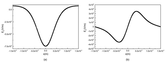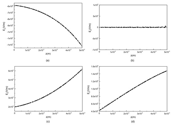In Figure 2 the components x and z of the electric field are reported as a function of the distance from the beam axis located at x = 0, as calculated in the middle of the LC layer (z = L/2, L being the height of the microchannel, i.e., the thickness of the LC layer). In Figure 3 the same components are plotted as a function of z, i.e., through the LC layer, both at the center of the beam (a and b) and at a distance x = 100 μm from the beam axis (c and d).
